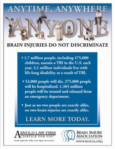 On behalf of the Brain Injury Association, Arnold Law Firm would like to announce Brain Injury Awareness Month! In a report recently issued by the Center for Disease Control and Prevention (CDC), it was estimated that 1.7 MILLION people sustain a traumatic brain injury every year – with TBI contributing to approximately 30% of all injury-related deaths here in the United States. Brain injuries typically fall into take one of two categories. The most common type of brain injury is known as a Traumatic Brain Injury or TBI, where the brain is injured as a result of physical trauma. The second type involves medical malpractice, where a victim is injured due to the mistake or negligence of a doctor or